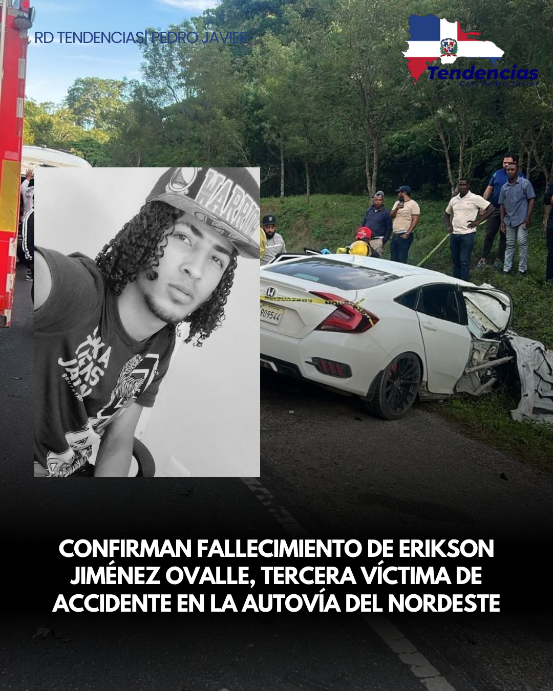 Santo Domingo.– Familiares confirmaron este sábado el fallecimiento de Erikson Jiménez Ovalle, quien permanecía ingresado en un centro de salud de la capital tras resultar gravemente herido en el accidente de tránsito ocurrido el pasado miércoles en la Autovía del Nordeste, en el tramo Salto Socoa, provincia Monte Plata.