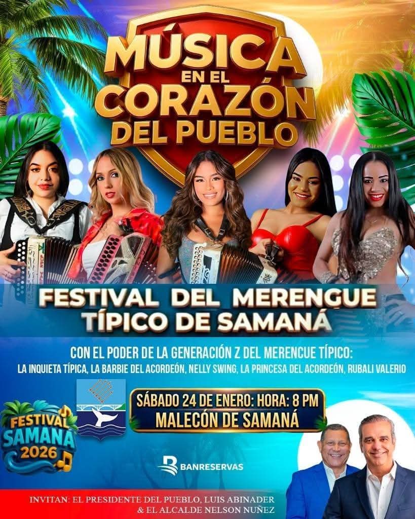 SÁBADO 24 DE ENERO FESTIVAL DEL MERENGUE TÍPICO (GENERACIÓN Z FEMENINA): LA INQUIETA TÍPICA, LA BARBIE DEL ACORDEÓN, NELLY SWING, LA PRINCESA DEL ACORDEÓN Y RUBALÍ VALERIO. HORA: 7:00 PM